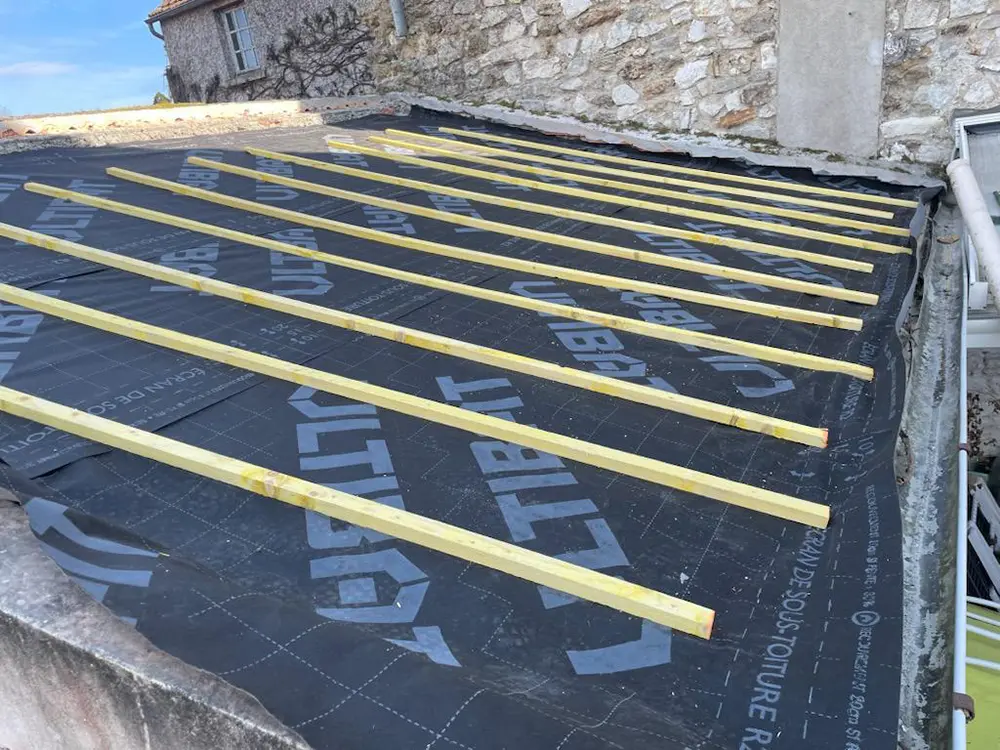 - Fixation des liteaux et des contrelattes pour préparer la base des tuiles.